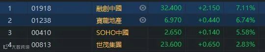 融创中国发布2020年业绩公告。公告显示,报告期内,融创中国实现营业收入约为2305.9亿元,同比增长约36.2%;毛利约484.0亿元,同比增长约16.9%;归母净利润约为356.4亿元,同比增长约36.9%;核心净利润约为302.6亿元,同比增长约11.8%。融创中国(01918)升7.11%,收市报32.4元。房地产股也普涨,宝龙地产(01238)升6.74%,收市报6.97元。SOHO中国(00410)升5.58%,收市报2.65元。