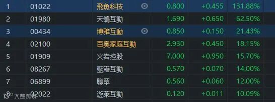 春节假期临近,游戏需求将迎来高增长。加之各地开始纷纷倡导春节减少出行,减少聚集,就地过年等应对策略,有券商预计以游戏为代表的“宅娱乐”需求将会依然旺盛。多只游戏相关股今早延续上周五升势,飞鱼科技(01022)暴升131.88%﹐收市报0.8元。天鸽互动(01980)升62.5%﹐收市报1.69元。博雅互动(00434)升幅也超过20%,获腾讯入股的百奥家庭(02100)有18%以上的的升幅。