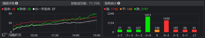 15日,指数早盘分化,上证弱势震荡,创业板指一度涨逾1%。指数午后震荡上行,创业板指再度上试2760压力位。汽车股尾盘集体冲高,市场题材轮动加速,生物疫苗、白酒、消费电子等板块相继活跃,券商股尾盘拉升回落,农业、半导体板块全天低迷。两市个股跌多涨少,涨跌比接近1:1,涨幅大于7%的个股61只,跌幅大于7%的个股27只,涨停个股48只,跌停个股58只,分化加大,市场情绪较低,总体偏弱,两市合计成交额7096亿元,赚钱效应较差。