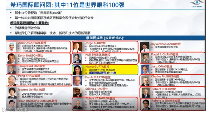 希玛的国际顾问团阵容强劲,每一位均为国家及地区眼科学会现任或前任会长级别,其中11位是曾获选「世界眼科100强」。
