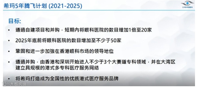 希玛国际眼科医疗集团是由国际著名眼科专家林顺潮教授 2012 年创立于香港,近年以眼科为主整合香港优质医疗资源进入其他医疗专科赛道。香港品牌立足深圳,渐渐幅射至全国主要城市。希玛提出5年扩张计划,在2025年前增加到50家医院以上,不排除由大湾区扩展到长三角。从长远来看,中国近年青少年近视率越来越高,眼科需求越来越大,对希玛来说也是扩张的好时机。