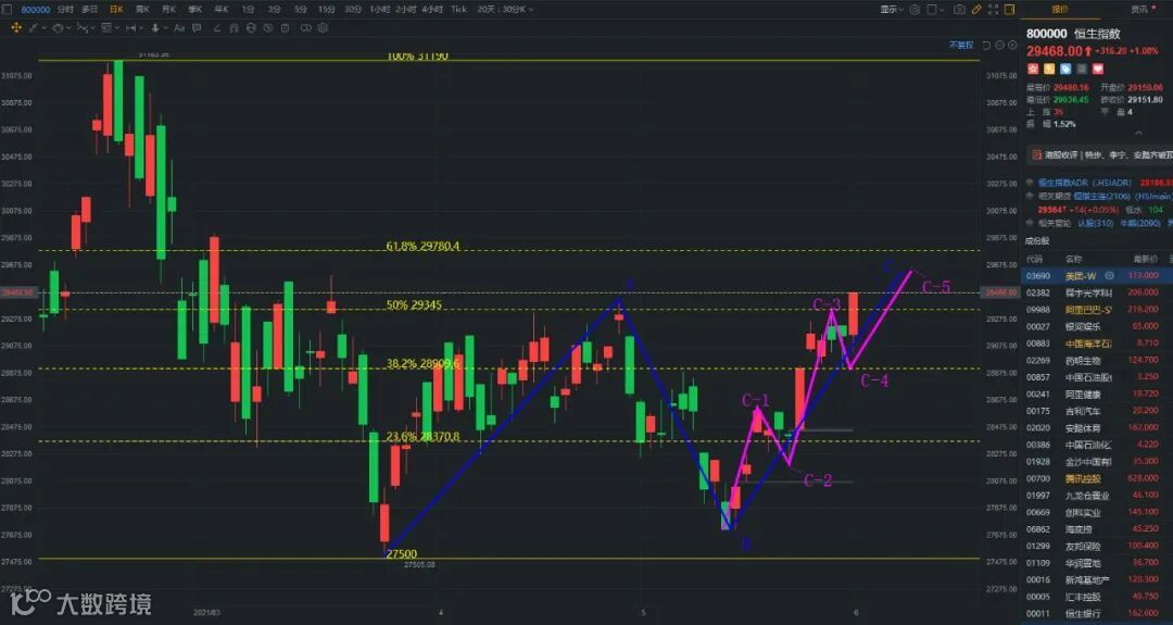 3、如下图粉色线所示,当前是C浪的5浪上涨中,目标区间就是29613-29780之间,5浪结束之后肯定有调整。