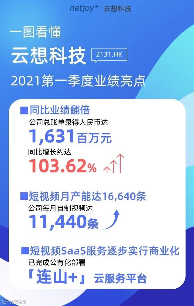 早前,云想公布一季度总账单金额约人民币16.3亿元,同比增长103.62%。公告称,公司将继续加大研发投入力度,推进SaaS与人工智能技术的商业化布局,把握短视频市场发展机遇。