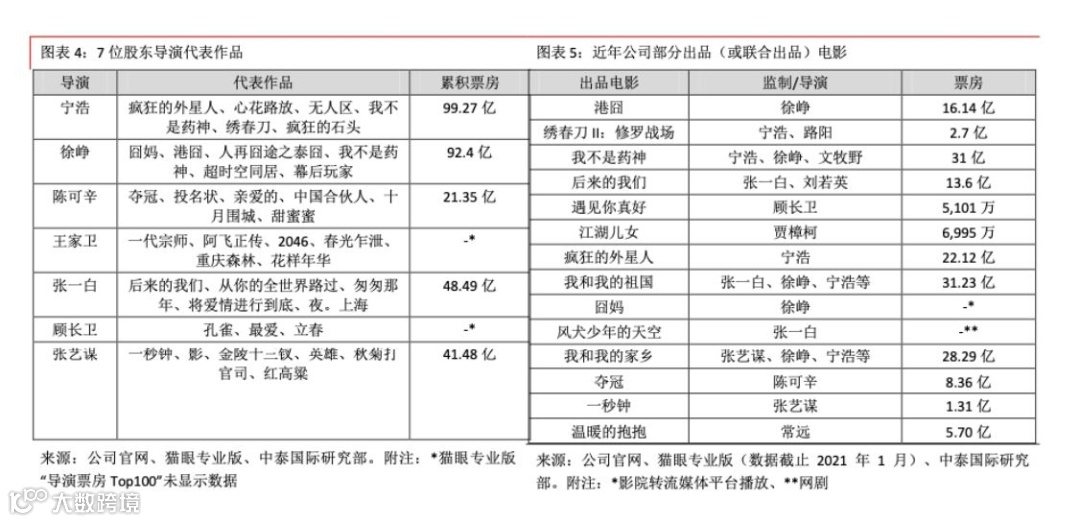 目前公司拥有7位著名股东导演包括徐峥,宁浩,王家卫,陈可辛,顾长卫,张一白,张艺谋,还有非股东导演有王小帅,贾樟柯,文隽,李扬,陈大明,刘心刚。