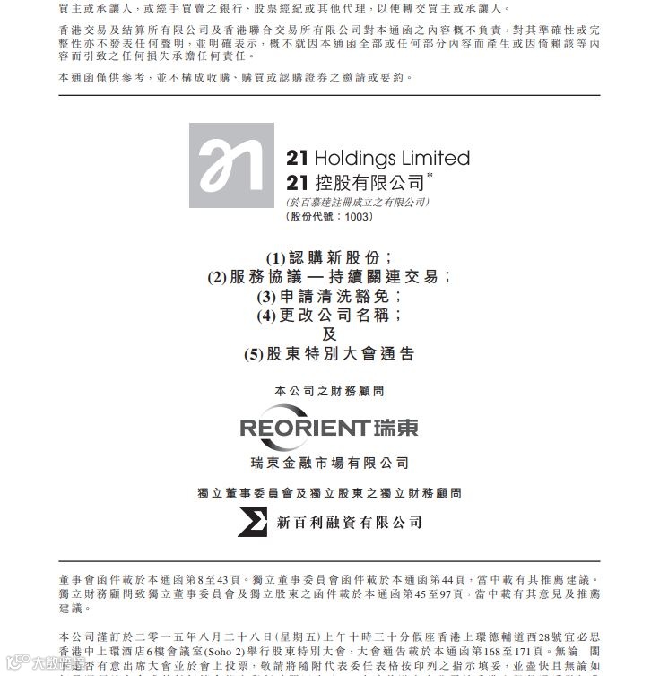 1003前生为21控股,但多年来因经营不善而亏蚀严,后来在2015年以印发1,701,416,556股易手,相当于(i)已发行股本约294.8%;及(ii)扩大之本公司已发 行股本约73.7%。