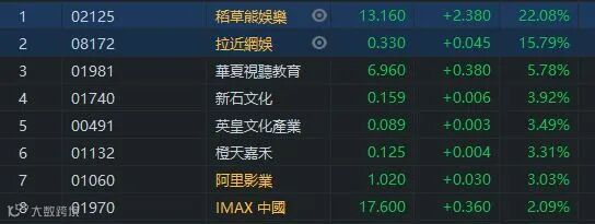 稻草熊娱乐集团发布2020年度业绩公告,截至同年12月31日,经调整后的净利润约为人民币1.309亿元,同比上涨100.1%。分析人士认为,随着影视市场的持续回暖,未来稻草熊娱乐的业绩增长将更加值得期待。稻草熊娱乐(02125)暴升22.08%,收市报13.16元。其他影视娱乐股普涨,拉近网娱(08172)升超过15%,阿里影业(01060)也有3.03%的升幅。