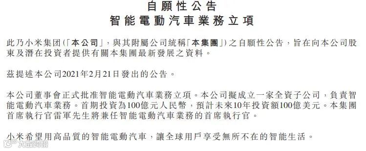 恒指结算日一如昨日说的窄幅振荡行情,这次反弹暂时结束。小米造车终于官宣了,计划投资100亿人民币,未来10年投资额100亿美元,由雷军兼任智能电动汽车业务的首席执行官。