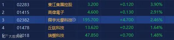 调查机构IDC提升对近期智能手机市场的展望,料今年出货量将达13.8亿台,按年增长7.7%,认为势头将持续至2022年,料届时出货量将按年增长3.8%至14.3亿台。手机概念股普涨,其中高徫电子(1415)升2.91%,舜宇光学(2382)升2.46%﹐瑞声(2018)也升1.48%。