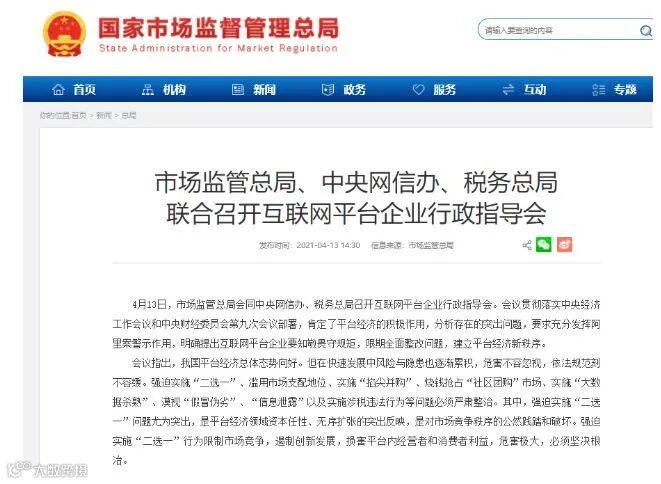 市场监管总局会同中央网信办、国税总局召开互联网平台企业行政指导会。会议要求,各平台企业要在一个月内全面自检自查,逐项彻底整改,并向社会公开《依法合规经营承诺》,接受社会监督。市场监管部门将组织对平台整改情况进行跟踪检查,整改期后再有发现平台企业强迫实施「二选一」等违法行为,一律依法从重从严处罚。