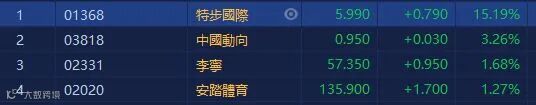 东兴证券发研报指,国内运动市场已全面复甦。该行认为,逐步增强的运动消费观念以及科技进步,以及政府对体育产业的鼓励政策,推动着运动鞋履行业的发展。运动服饰公司年报靓丽,继续推荐相关优势标的。体育用品股普涨,特步(01368)升15.19%﹐收市报5.99元。中国动向(03818)也升超过3%,李宁(02331)及安踏(02020)升超过1%。