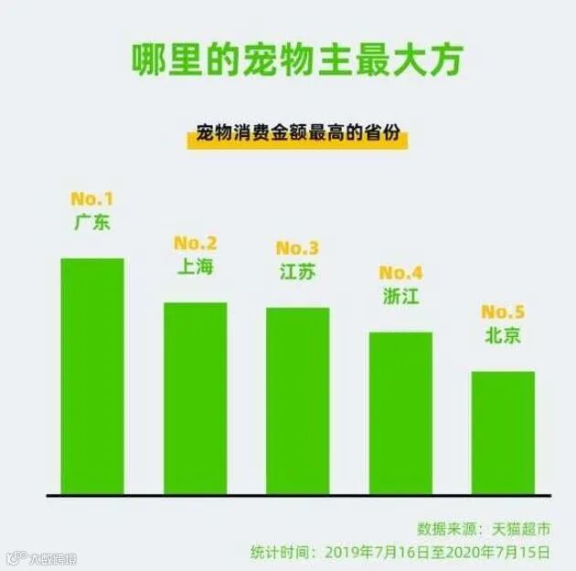 宠物经济火热,天猫数据显示,上海、广东、江苏三地宠物主消费金额位列全国最高。其中深圳和珠海消费者在2019年豪花6万元人民币在打理心爱的宠物上,成为中国最大方的主人。
