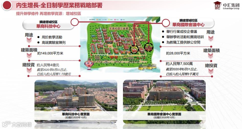 (1) 扩张和新校区的开发,现有大湾区核心区域三大校区(广州增城、肇庆四会及江门新会)其实已经饱和,而新校区正在按计划逐步落成。其中,肇庆四会新校区计划统共可容纳约16,000名学生,第一期校区已于2020年9月投入使用,第一期已释放6,000名学生容量;江门新会校区第一期计划在2021年9月投入使用,将为集团增加12,000名学生容量。另外,现有的校区亦在升级,华商科技中心和华商国际会议中心正在建造中。未来,三个校区合计将会为集团学历和非学历教育带来逾8万人的学生容量,比现时的3.8万名学生上升超过一倍。