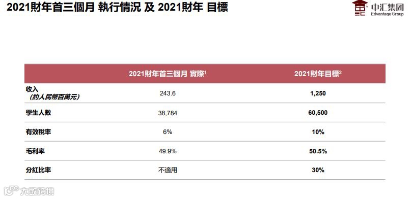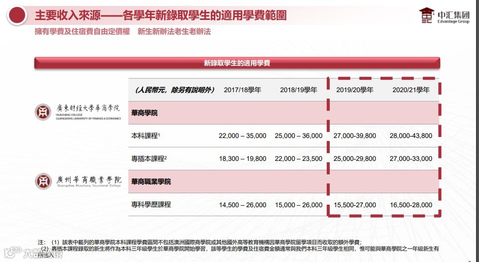 中滙现时在校学生超过3.8万人,主要收入的两所华商学院及华商职业学院,均以商务课程为课程重点,而且由于收生要求不低,加上就业率高,一直有不少学生报读,同时学费增幅亦不少,在招生及定价上一直都是相对强势。