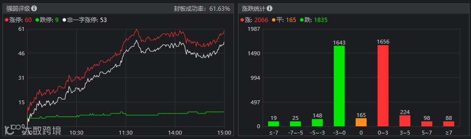 在上周上证迎来三连阳之后,指数早盘整体震荡上行,午后整体冲高回落,沪指时隔两个多月后收盘再度站上3400点整数关口。两市个股依然还是涨跌互半,涨跌比1:1,涨幅大于7%的个股有88只,跌幅大于7%的个股则只有19只;其中涨停60只,跌停9只,两市合计成交额9439亿元,北向资金持续净流入120亿元。截至收盘,上证指数涨1.09%,报3414.49点,深证成指涨0.74%,报13955.28点,创业板指涨0.72%,报2686.36点。