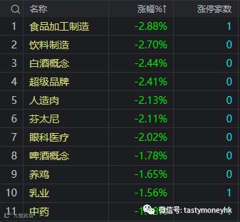 白酒概念、饮料制造、食品加工、超级品牌等板块个股处于跌幅榜。