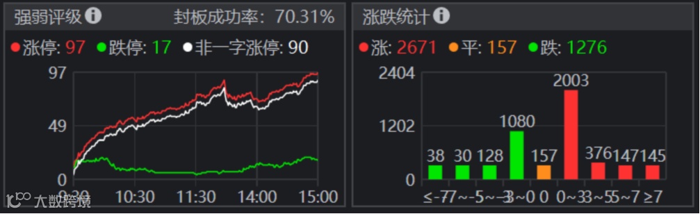 25日,指数开盘后一度下跌盘整,随后持续震荡上行,全天低开高走,震荡走高。两市个股涨多跌少,涨跌比2:1,涨幅大于7%个股145只,其中涨停97只,涨停家数创近期新高,跌幅大于7%个股38只,其中跌停17只。两市合计成交7938亿元,实现价升量增,摆脱了近两周来的放量下跌缩量反弹的局面。截至收盘,上证指数涨0.99%,报3396.56点,深证成指涨0.73%,报14017.06点,创业板指涨0.71%,报2840.80点。