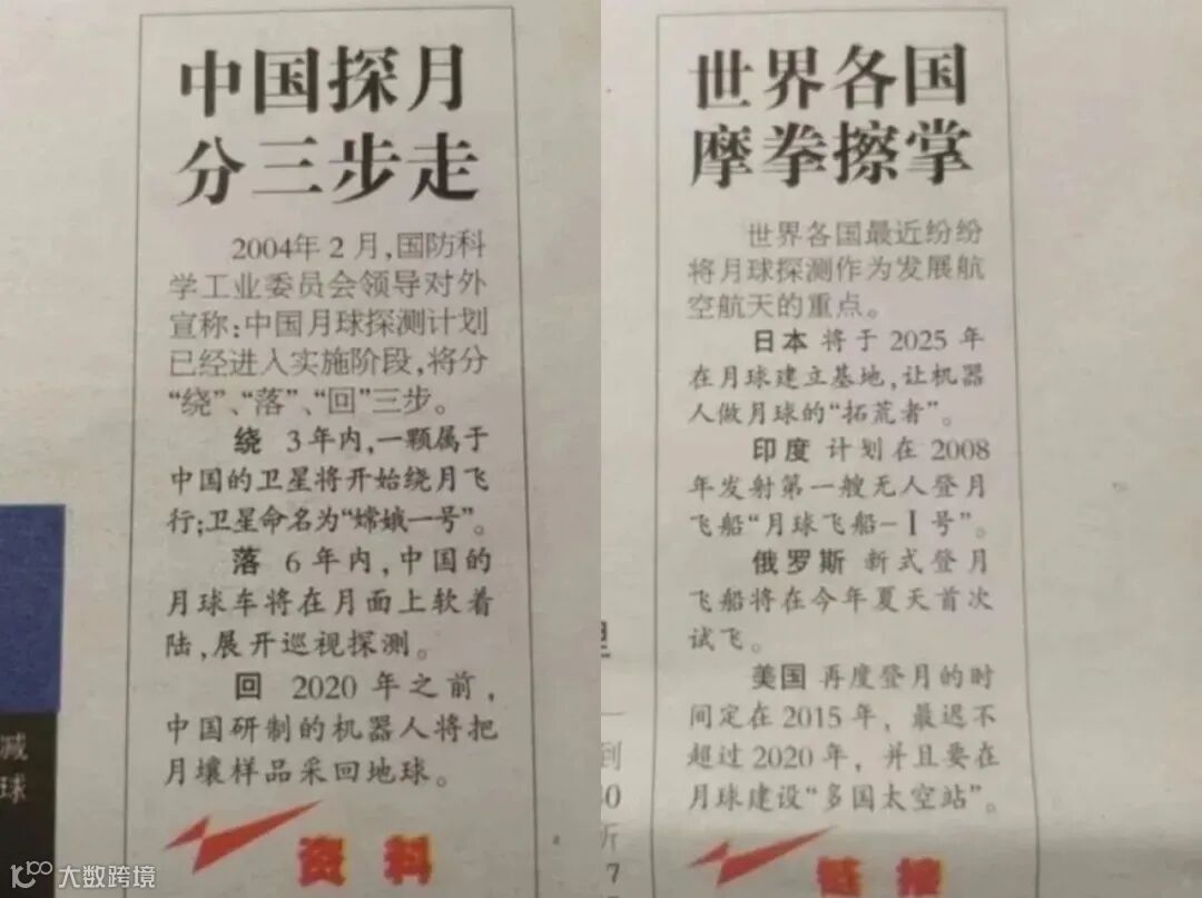 2005年的《科学发现报》一角写着:“国防科学工业委员会领导对外宣称,中国探月计划已进入实施阶段,3年内,一颗属于中国的卫星将开始绕月飞行;6年内,中国月球车将在月面软着陆;2020年之前,中国研制的机器人将把月壤样品采回地球。”