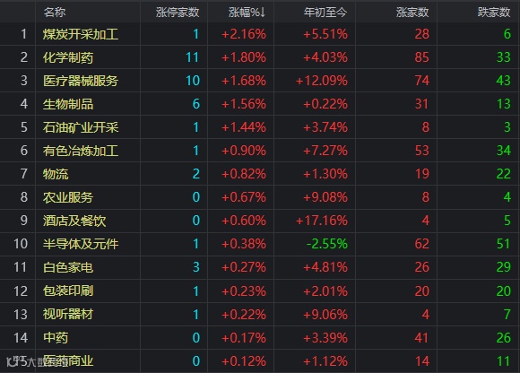 盘面上,医药股共同药业、亚太药业、之江生物、四环生物、华海药业等一大批个股涨停;新冠检测板块全天保持强势,硕世生物、奥泰生物涨超13%,明德生物、恒基达鑫涨停;白色家电表现活跃,禾盛新材、科沃斯涨停;煤炭概念午后拉升,晋控煤业涨停;物流板块异动拉升,韵达股份涨停;半导体及元件早盘活跃,明微电子涨20%;华为汽车板块异动拉升,维科技术、小康股份涨停;计算机设备走弱,华铭智能、同有科技跌超10%;白酒概念午后持续下挫,迎驾贡酒跌停;证券板块走弱,哈投股份、中泰证券领导跌。