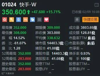 瑞银发研报指,首予快手-W「买入」评级,目标价430港元,以反映2021至2022年预测市销率的16.4倍及11.2倍。按用户花费的时间计算,快手是中国第三大在线流量生态系统,也是全球第二多每日活跃用户的短视频APP,其市场地位显著,拥有庞大的用户基础,目前仅处于变现早期阶段,变现水平落后于其他互联网企业,增长前景可期。快手(01024)升 15.71%,收市报350.6元。快手总市值已经超过1.44万亿﹐果然很快手。