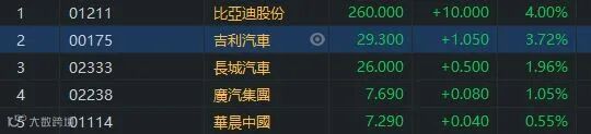 吉利汽车在昨日收盘后发布2021年1月销量公告:单月汽车批发总销量(含领克)15.6万辆,同比增长40%,环比增长1%;其中,新能源汽车销量4,289辆,占总销量2.7%;出口销量10,031辆,同比增长343%;中国市场销量14.6万辆,同比增长34%,完成全年目标153万辆的10%。吉利汽车(00175)升3.72%,收市报29.3元。比亚迪(01211)升4%,收市报260元。