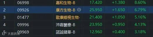 针对沪深港通纳入范围扩大,有助于对未盈利生物科技公司股票注入流动性,并有望助力科创版及港股资质优异的生物科技股扩大市场影响力。适用范围的扩大也有望为整体H股和A股市场进一步注入流动性,并且满足两地投资者对投资生物科技等新经济板块的需求。嘉和生物(06998.HK)升8.6%,收市报17.42元。康方生物(09926.HK)、欧康维视生物(01477.HK)及沛嘉医疗(09996.HK)升幅都超过4%。