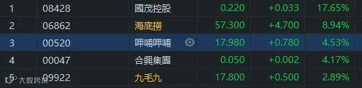 花旗发研报指,海底捞翻枱率回覆至3.5至4倍,同店翻枱率亦回覆至去年10月80-90%水平,相信11月可维持,虽然各地区复甦步伐不一致,但整体同店销售和翻枱率亦大致符预期,认为经营环境在11-12月有改善,年底数字可回覆至90%。中短期看呷哺改善/稳定开店和凑凑快速开店,长期看调味品快速增长。公司已经形成了呷哺/凑凑/调味品/呷煮呷烫四大品牌体系,未来将会接力式发展。海底捞(06862.HK)升8.94%,收市报57.3元。呷哺呷哺(00520.HK)升4.53%,收市报17.98元。