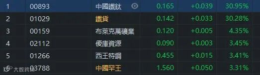12月份铁矿石尚有200-250万吨的供需缺口,供需维持紧平衡。此外,市场传言印度方面为保证其国内矿石的使用,考虑重新开始禁止铁矿石出口;巴西进入雨季,发货量将面临季节性下滑;澳大利亚与中国关系持续降温。综合来看,铁矿石价格短期有望继续走强。中国鐡钛(00893.HK)及鐡货(01029.HK)升幅高达30%。