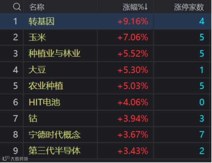 盘面上看,中央经济工作会议提“种业翻身仗”打响,转基因概念大涨9%,农业种植板块全天强势领涨,荃银高科(300087)涨约15%,农发种业(600313)、丰乐种业(000713)、隆平高科(000998)、登海种业(002041)等多股涨停;中央经济工作会议要求强化国家战略科技力量,半导体、光刻胶等板块走强,帝科股份(300842)、惠伦晶体(300460)、南大光电(300346)涨逾10%,士兰微(600460)、振华科技(000733)等封板;锂电池、有色钴等板块午后走强,星云股份(300648)大涨20%,银禧科技(300221)涨13%,雄韬股份(002733)、露笑科技(002617)、比亚迪(002594)、华友钴业(603799)等十余股涨停;汽车整车板块活跃,东风汽车(600006)江铃汽车(000550)双双涨停。