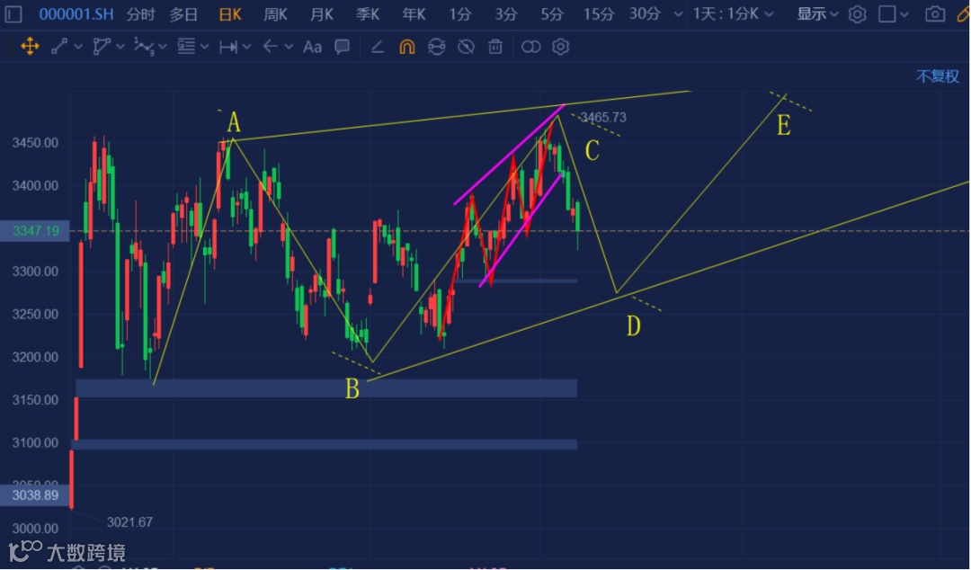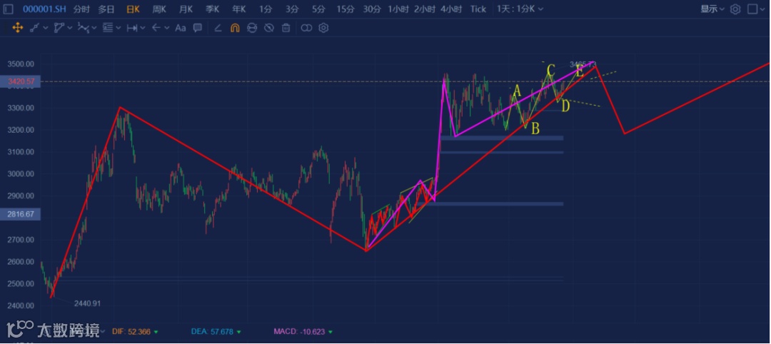 在上一周的分析里,我们认为指数会调整到3300点之后才反弹,走上图中的E段。市场比预期的稍强,在3325点已经止跌,提前展开行情。明年的行情,粉色第5浪高点与黄色E浪高点重合,然后,大约如下图红色标示。