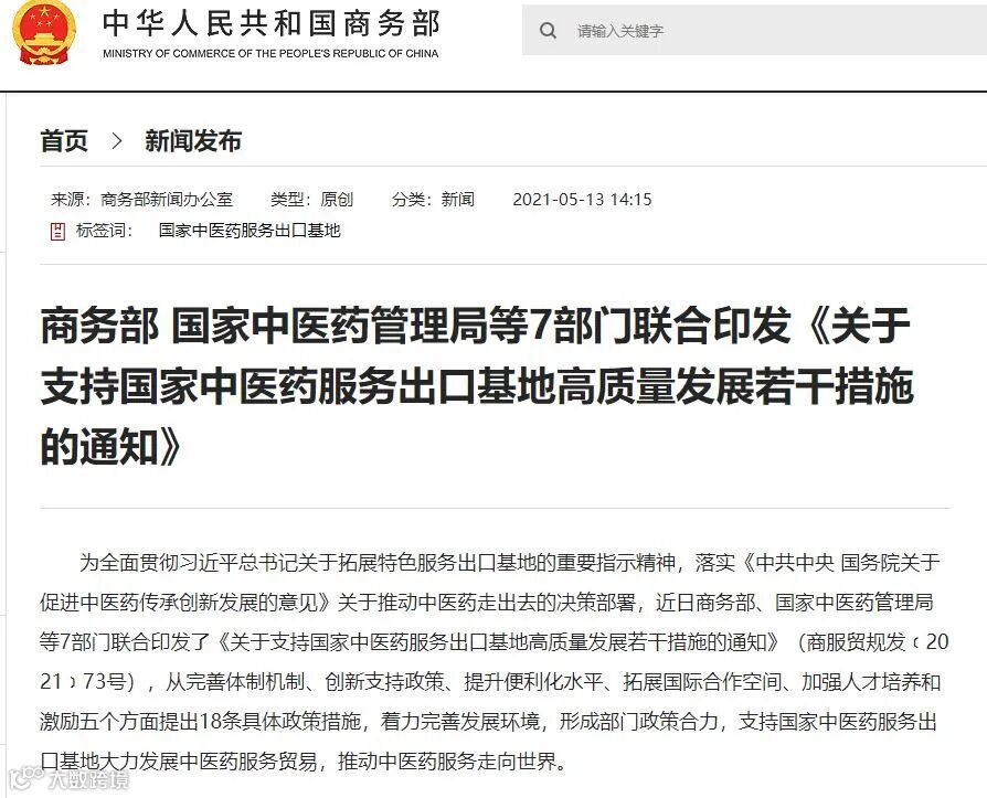 近日商务部、国家中医药管理局等7部门联合印发了《关于支持国家中医药服务出口基地高质量发展若干措施的通知》,从完善体制机制、创新支持政策、提升便利化水平、拓展国际合作空间、加强人才培养和激励五个方面提出18条具体政策措施,着力完善发展环境,形成部门政策合力,支持国家中医药服务出口基地大力发展中医药服务贸易,推动中医药服务走向世界。