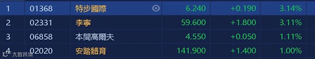 海通证券近日发布的研报称,大中华地区未来5年内仍是全球范围运动服饰市场增速领先的区域,运动时尚市场规模最大,推荐安踏体育、滔博及特步国际等标的。体育用品股普涨,其中特步(01368)及李宁(02331)升超过3%,安踏(02020)也有1%的升幅。