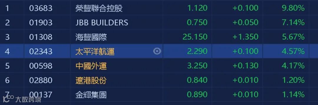 海岬型船运价指数上涨9点或0.3%至3151点,为1月中旬以来的最高水平,海岬型船日均获利上涨76美元至26131美元。巴拿马型船运价指数从昨日触及的逾两个月低点反弹,周三上涨119点或6.3%,报2017点,巴拿马型船日均获利上涨1074美元至18157美元。超灵便型船运价指数上涨9点,报1783点。太平洋航运(02343)升4.57%,收市报2.29元。中国外运也有4.17%的升幅。
