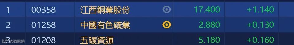 高盛分析师Nicholas Snowdon、Daniel Sharp和Jeffrey Currie在研报中表示,随着全球绿色能源转型推动需求,如果铜价继续保持在每吨9000美元附近,那么到2023年初,全球库存将耗尽。铜股走高,江铜(00358)升7.01%,收市报17.4元。中国有色矿业(01258)升4.73%,五矿资源(01208)也有3.19%的升幅。