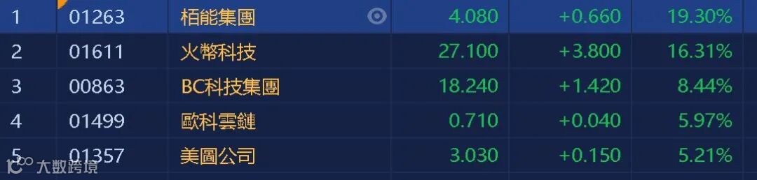 加密第一股coinbase即将于今晚在美上市之际,比特币持续上涨,今日盘中最高涨至63860美元,再创历史新高,市值超1.18万亿美元,位居全球第6。港股区块链股全线高开,其中栢能集团(01263)升19.3%,收市报4.08元。火币(01611)也升超过16%,BC科技(00863)也有8.44%的升幅。