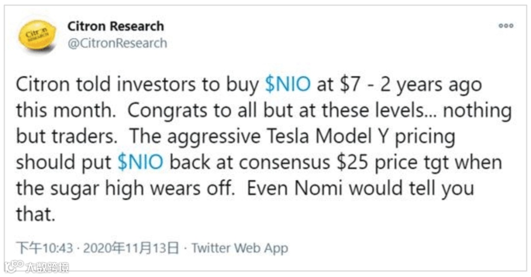 香橼认为现在购买蔚来股票的人都不是押注公司本身或其潜力,而是在购买3个屏幕上跳来跳去的交易代码而已,即具有投机属性。香橼还说押注中国汽车市场电气化转型有更好的方法,现在是时候获利了结,并寻找下一个颠覆性技术了。