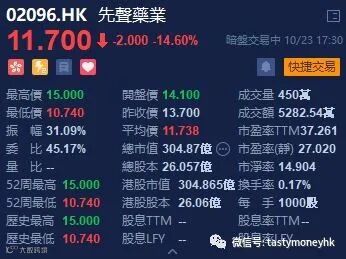 最后说说IPO,先声药业(02096.HK)最终定价13.7港元,每手1000股,每手13700港元。一手中签率5%,认购倍数约589.47倍。先声药业曾是中国第一家登陆纽约证券交易所的生物和化学制药公司。2013年,公司从美股退市,完成私有化。截止5点半﹐先声药业富途暗盘价跌14.6%,报11.7元,每手不计续费亏2000元,相信令到不少打新股民失望。