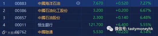 大摩发表研究报告指,中海油今年第三季度的产量,资本开支及成本均符合预期,而修订现有不竞争承诺有助在不寻常的环境下保护股东利益,予目标价9.55港元,评级为增持。消息刺激石油股上升,成为恒指上升的主要动力,中海油(00883.HK)升7.27%,收市报7.67元。中石化(00386.HK)升6.67%,收市报3.2元。中石油(00857.HK)升6.48%,收市报2.3元。