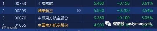 中金发表报告指,当前是航空板块盈利和预期的低点,受国内航空需求持续恢复叠加人民币兑美元升值等利好,三季度航司盈利有望环比减亏,预计航空股两年有翻倍机会。消息带动航空股造好,中国国航(00753.HK)升3.61%,收市报5.46元。东方航空(00670.HK)升3.54%,收市报3.38元。南方航空(01055.HK)升2.97%,收市报4.5元。