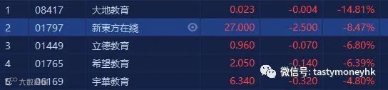 今日科技股表现弱于大市,恒生科技指数收跌1.78%报7484.48点。成分股当中新东方在线(01797.HK)领恒生科技指数,收市跌8.47%,报27元。因为昨晚美股中概教育股集体大跌,有传闻称跟谁学出现亏损,甚至传闻单个季度亏损9个亿,跟谁学暴跌30.8%,带动整个中概教育股集体下跌。立德教育(01449.HK)及希望教育(01765.HK)跌超过6%。