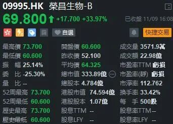 最后说说IPO荣昌生物(09995.HK),每股发售股份52.10港元,每手500股,一手中签率90%,认购5手稳中一手。荣昌生物是一家正在进入商业化阶段的生物制药公司,致力于发现、开发和商业化创新的、有特色的生物药,用于治疗中国乃至全球多种医疗需求未被满足的自身免疫、肿瘤科和眼科疾病。荣昌生物开发了拥有超过十种候选药物的产品线,有五种处于临牀开发阶段,正在针对17种适应症进行临牀开发,另外还有五种以上候选药物已提交试验性新药(IND)申请或处于IND申请提交筹备阶段。荣昌生物升33.97%,收市报69.8元,不计手续费每手赚8850元,表现相当不错。