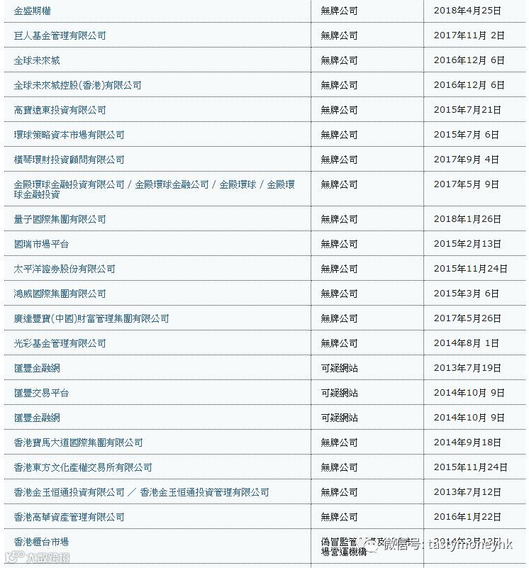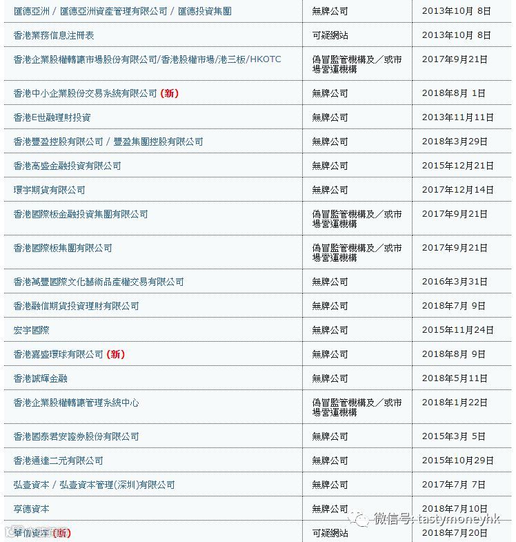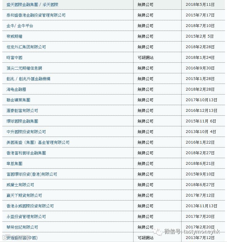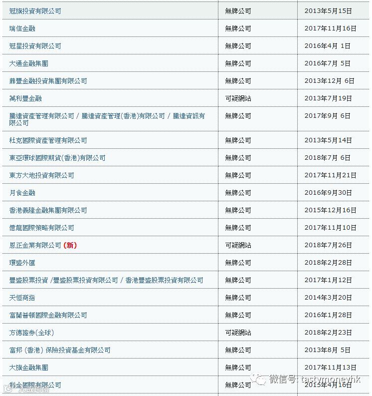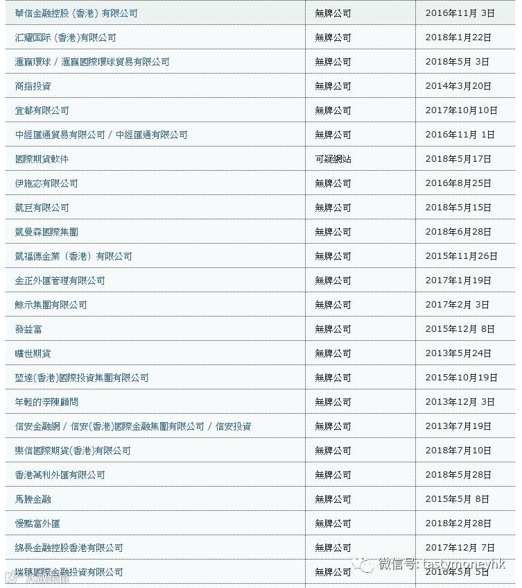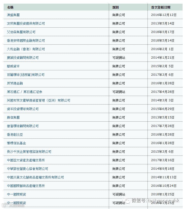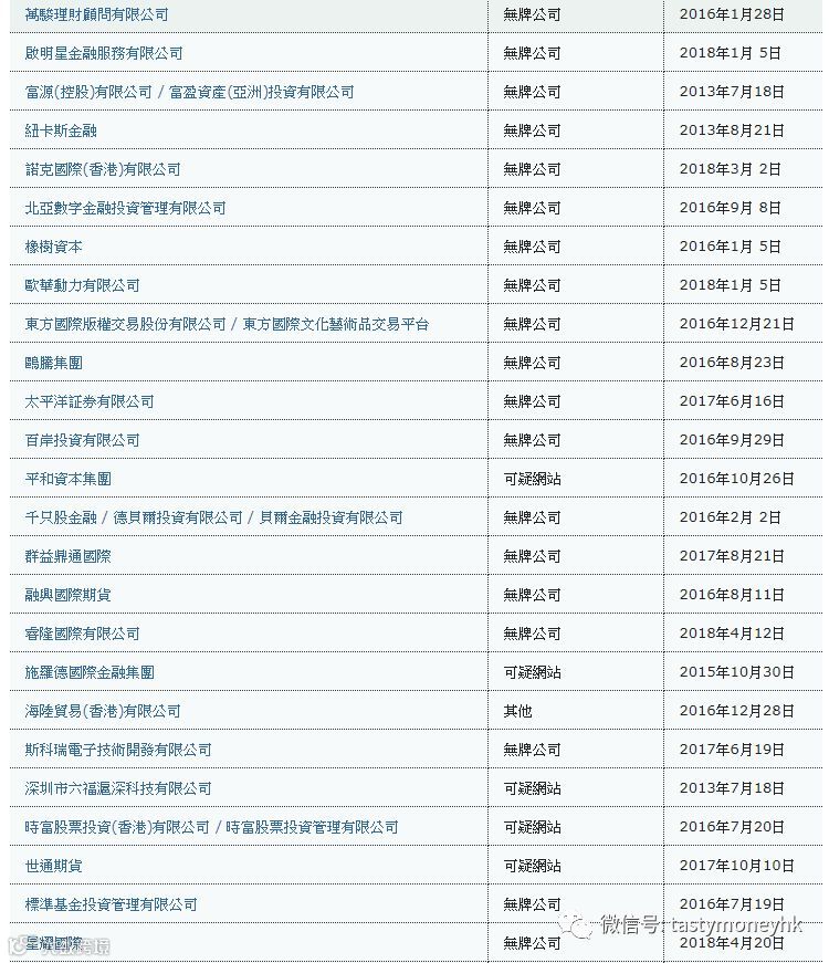 香港的股票号码都是四位数以内的,只有窝轮和牛熊证才会有五位数的。居然写20269,小编昨天看到的时候都傻眼了!为了不让它再骗到朕深爱的妃子们,所以朕整理了一些无牌公司及可疑网站名单,大家可以参考一下!(图片来自︰香港证券及期货事务监察委员会)