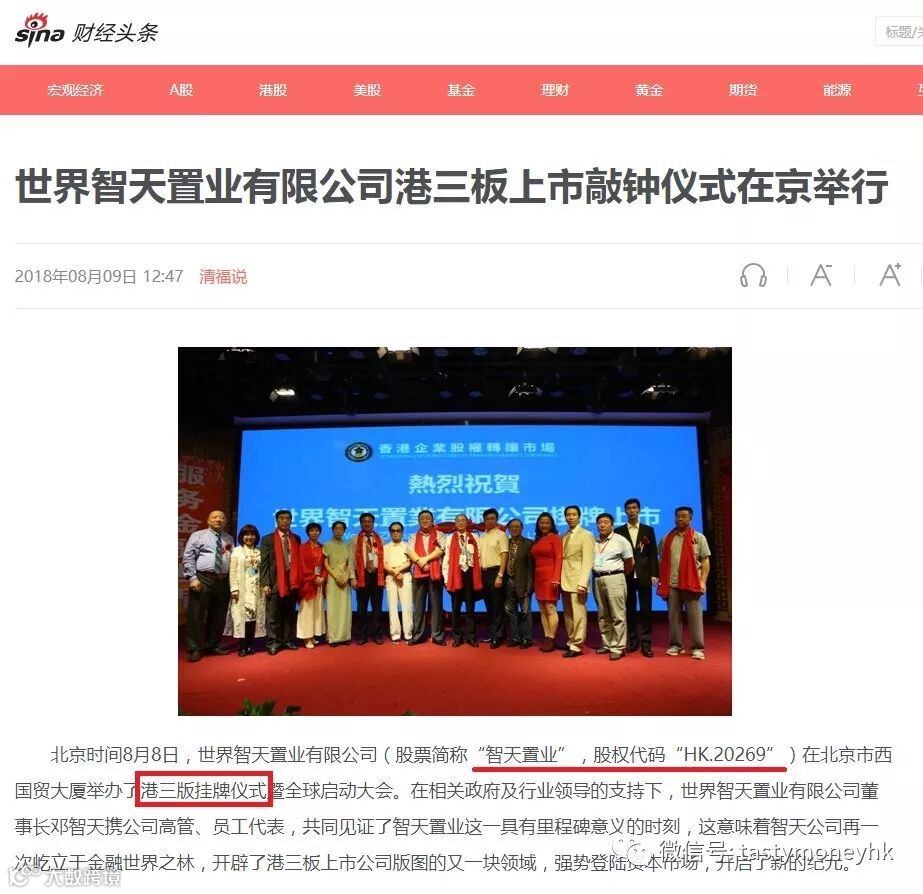就以这个「智天置业」为例,它说股权代码是hk.20269,举办了港三版挂牌仪式。