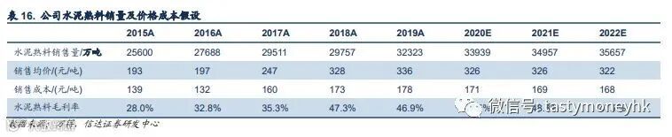 2006-2018年,海螺水泥熟料产能由5900万吨增加至2.52亿吨,累积增加1.93亿吨,平均每年增加1608万吨。水泥产能由6500万吨增加至3.53亿吨,累积增加2.88亿吨,平均每年增加2400万吨。到了2019年,海螺又新增熟料产能90万吨,水泥产能625万吨,骨料产能1,690万吨,商品混凝土产能240万立方米。由于水泥产能的扩张部分是用于消化熟料,熟料的产能扩张应更好地代表了海螺水泥的原生扩张速度。2020年预计全年新增熟料产能450万吨、水泥产能770万吨。