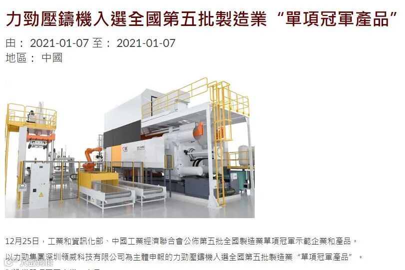 近日,工业和信息化部公布第五批制造业单项冠军及通过复核的第二批制造业单项冠军企业(产品)名单,以力劲集团深圳领威科技有限公司为主体申报的力劲压铸机入选全国第五批制造业“单项冠军产品”。