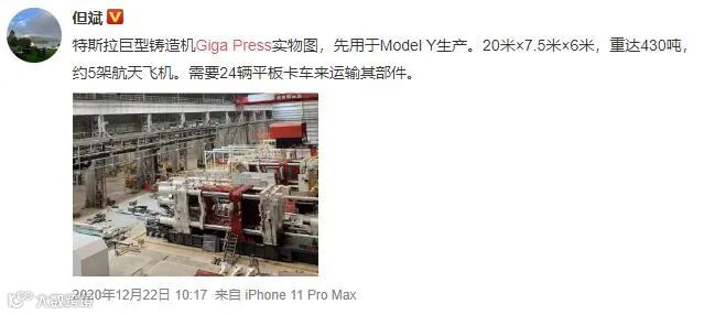 马斯克表示,非常兴奋看到特斯拉 Fremont 工厂的压铸设备开始运转,这是世界最大压铸机,可让车身后部一体成型,包括防撞梁。