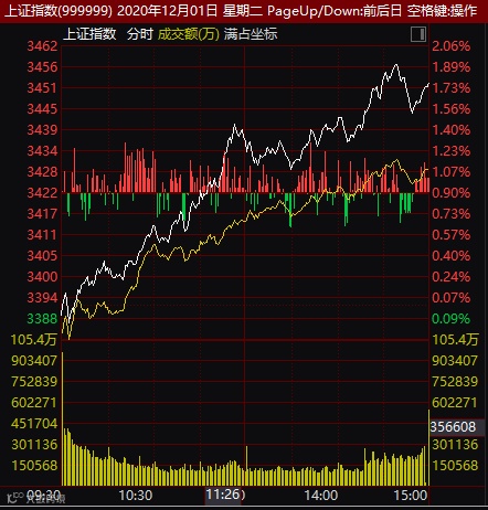 12月的第1日,指数全天单边上行,创业板指大涨2.5%,沪指、深成指涨近2%。两市个股普涨,所有行业板块集体飘红,没有下跌的板块。银行、券商等金融板块爆发,云游戏、汽车、数字货币、可降解塑料、医疗疫苗等板块涨幅居前。市场普涨之下,两市共有626只个股下跌,涨跌比5:1,涨幅大于7%的个股93只,跌幅大于7%的个股则有9只;两市合计成交8650亿元,北向资金净流入近200亿元。截至收盘,上证指数涨1.77%,报3451.94点,深证成指涨1.90%,报13930.37点,创业板指涨2.53%,报2698.44点。