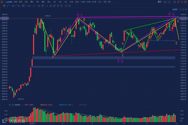 市场如果属于反弹行情的话,从技术分析,明天就会不创出反弹新高,应该开始下跌了。3458就有这么大的阻力?这么难越过吗?技术分析,如果把当前当作是3月份低点起来的第5浪看待(如下图粉色线标示),上证自7月27日3174低点起来的反弹(粉色线昨天标示C浪)变成5-3浪,即将进入(或者已经运行到)5-4和5-5浪,这样还是一个楔形结构,则昨天的冲高回落和今天的反弹都是高位开始震荡的一部分,5浪的高点还是有限。破坏(或者改变)这个楔形结构的制约,必须是连续放量上攻,变成3浪主升浪。