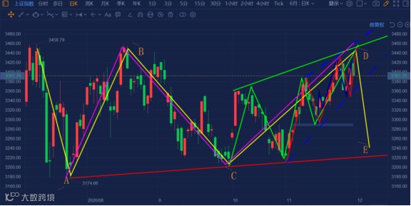 市场早盘还是延续沪强深弱,主板强于中小创的格局,上证最高3456.74点,刚刚过了8月13日的高点是3456.72点,距离7月份3458.79还是差2个点。早盘两市个股普涨,但是,涨幅大于5%的个股只有162只,到收盘涨幅大于5%的个股仅剩下108只,比平时大幅萎缩,表明大多数个股不愿追高,市场氛围整体较差。中午解盘时分析,上证等权重指数是7月份后低点起来的一个收敛三角形形态,高点在今天早上已经出现,这个位置先观望,下午应该是高位整理。分析对了一半,错了一半,建议观望没错,下午的下跌比预期来得快了一点。沿着前期的分析,上证今天没有破3458高点,各短周期(绿色、红色、蓝色线标示,如下图)5浪上涨结束,自7月份开始的调整也是当作大三角形的D浪上涨结束(黄线标示),又或者是上证自7月27日3174低点起来的反弹(ABC3三波段,粉色线标示)结束。后市,上证的调整如果是黄色线所示,走E浪调整,上证不破3174点,在红色线附近展开反弹,并且上破3458创新高。未来,上证跌破3174点,则是如粉色线所示的B浪结束,C浪下跌破3174低点,再创新低。这个是后话,到时候再分析。如果上证还有新高行情,短期必须快速放量上攻。否则短期上证注意上涨趋势线下轨的支撑,明天不破,还有反弹,下轨破了,继续向下调整。创业板指还是当作反弹的行情。创业板指注意2700点压力。