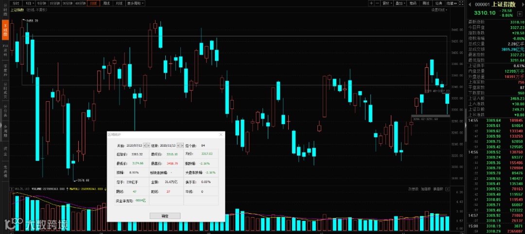 13日,A股三大指数集体低开,早盘触底反弹,全天震荡。白酒概念股全线重挫,午后冷链运输概念拉升,钛白粉、有色金属、汽车、军工等板块涨幅居前。两市个股依旧涨跌互半,涨幅大于7%的个股有56只,跌幅大于7%的个股则有37只,两市合计成交额7272亿元。截至收盘,上证指数跌0.86%,报3310.10点,深证成指跌0.27%,报13754.55点,创业板指涨0.23%,报2706.81点。
