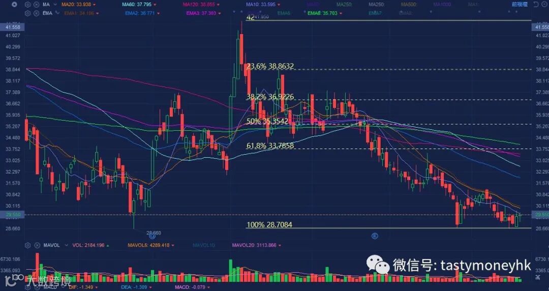 融创分拆旗下物业管理公司来港上市,计划集资10亿美元。由于融创服务业绩增长强劲,加上母公司销售理想,物管的生意会越做越大。11月初进行除净,基金为了得到物管股份额,要在11月之前增持融创。融创中国卖点十足,短期反弹可期。由图表看,融创中国近期做了双底,证明了获得市场的支持,短期反弹可以35元为目标价。